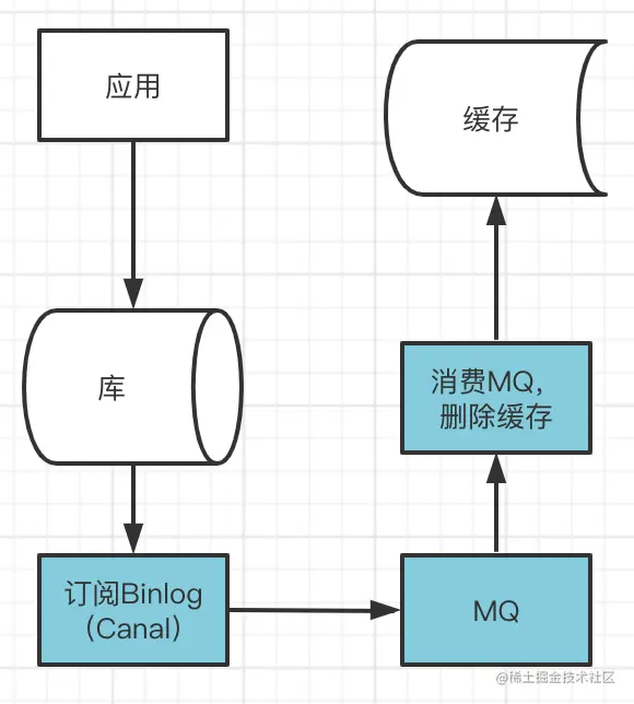 这种方案,可以把缓存删除逻辑从业务代码中剥离,业务开发专注于业务;但是需要引入额外的组件,花费更高的维护成本。