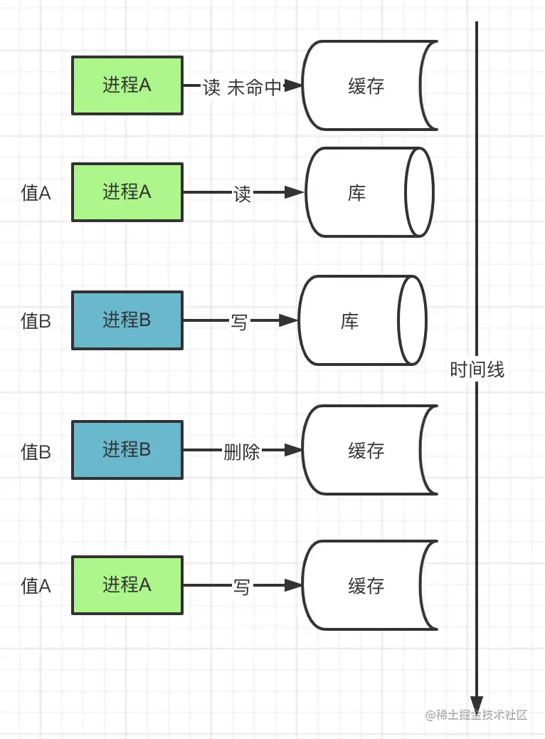 此时库中数据是B,缓存中是A,出现了数据不一致。