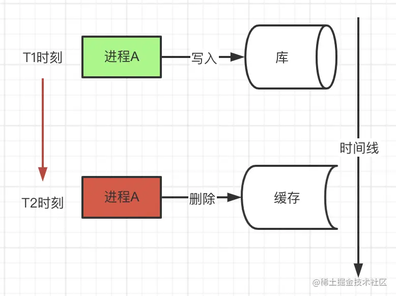 如上图,进程A在T1时刻数据写入库中,T2时刻删除了缓存。在高并发场景下,T1和T2时刻之间的读请求从缓存中读到的数据和库中的数据会出现不一致。