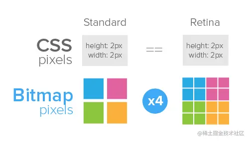 举例说明,对一个标准屏来说,渲染一个 2px*2px 的盒子将会使用 2px* 2px 物理像素,如我们的普通电脑屏;但是对于一个 2 倍屏来说,渲染一个 2px*2px 的盒子将会使用 (2px* 2) *(2px* 2) 物理像素,如我们的 iPhone 4、5、6、7,如下图: