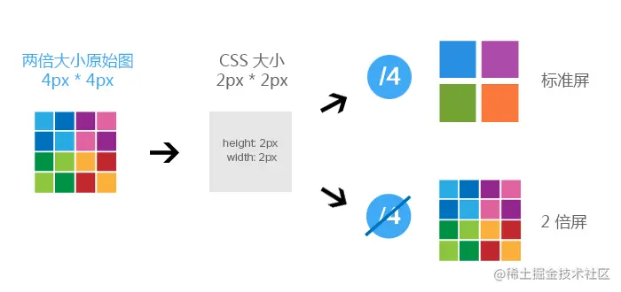 那么怎么解决该问题呢?我们可以把要使用的图片扩大一倍,如要用的图片大小为 2px 2px,我们可以使用 4px 4px 的图片然后设置图片大小为 2px * 2px,这样对于2倍屏则正好,而标准屏则减少像素取样(一定程度上的浪费),如下图: