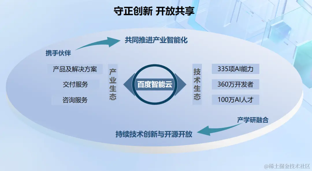 在技术生态方面,百度一直秉持着技术创新与开源开放的理念,现如今,百度飞桨已汇聚了360万开发者,百度大脑对外开放330多项 AI 能力,同时百度坚持产学研融合,共同培养了超过100万 AI 人才。在产业生态方面,百度与生态伙伴一起,在咨询、服务、交付、产品及解决方案等方面共同合作,帮助行业伙伴实现智能应用的落地实施。