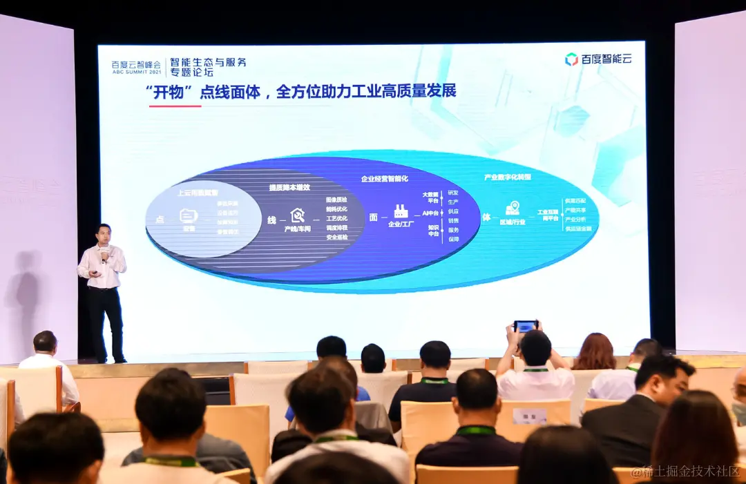 百度智能云工业能源产品研发总经理黄锋分享了百度工业互联网品牌“开物”赋能工业智能化转型的案例。“开物”依托百度强大的互联网基础和领先的全栈人工智能技术,通过“点、线、面、体”四个层面,为制造、能源、电力等工业企业、产业链和区域产业发展提供 AI+工业互联网和智能制造整体解决方案,帮助企业以低门槛利用新一代信息技术实现降本提质增效,产业链供应链协同,助力区域产业实现数字化、智能化升级。