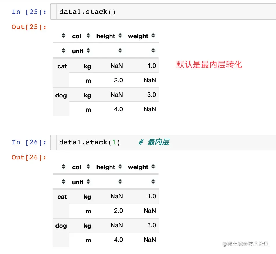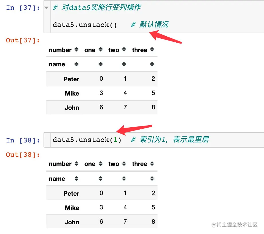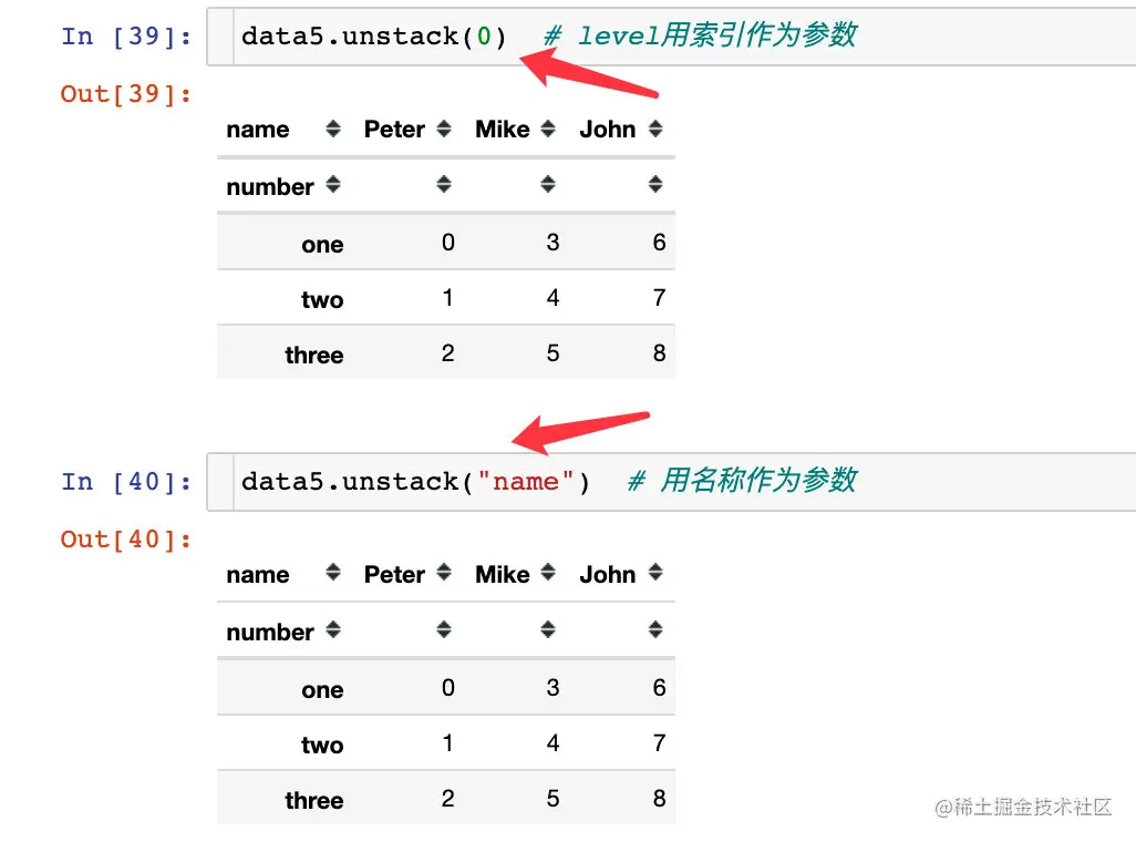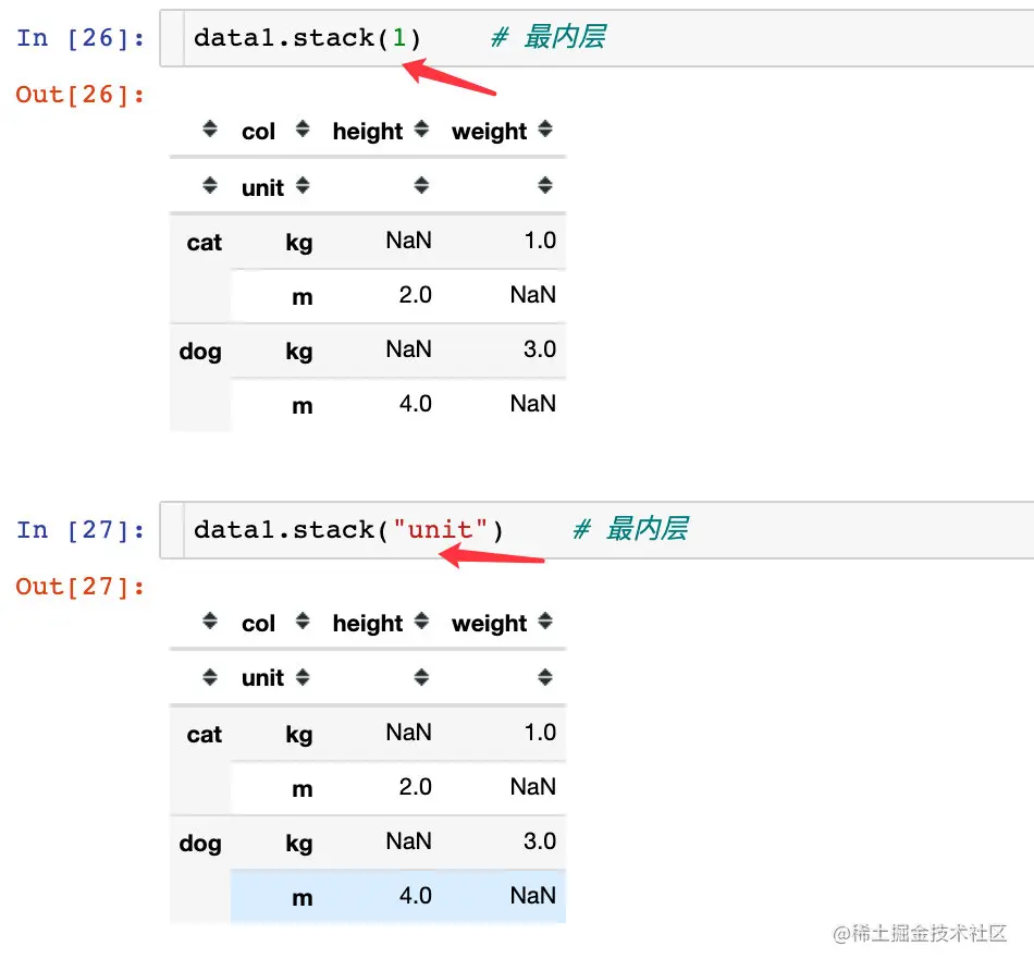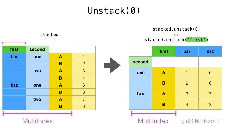 来自官网的两张图,在不同的索引号进行unstack操作的结果对比,默认是unstack(1):