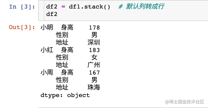 stack函数的主要作用是将原来的列转成最内层的行索引,转换之后都是多层次索引。官方原文: