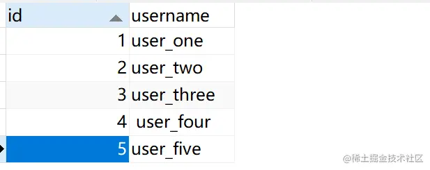 可以看见,由于锁住的是不同的记录行,所以两个记录锁并没有相互排斥,来看一下现在表中的数据,由于事务 1 还没有 commit,所以应该是只有 id = 2 的 username 被修改了: