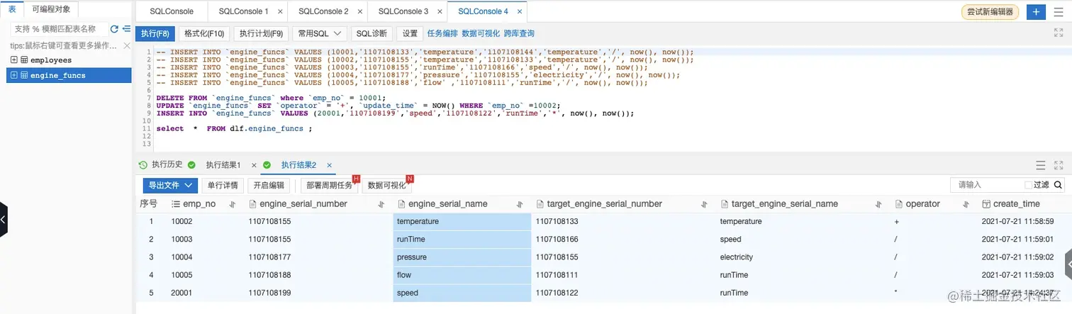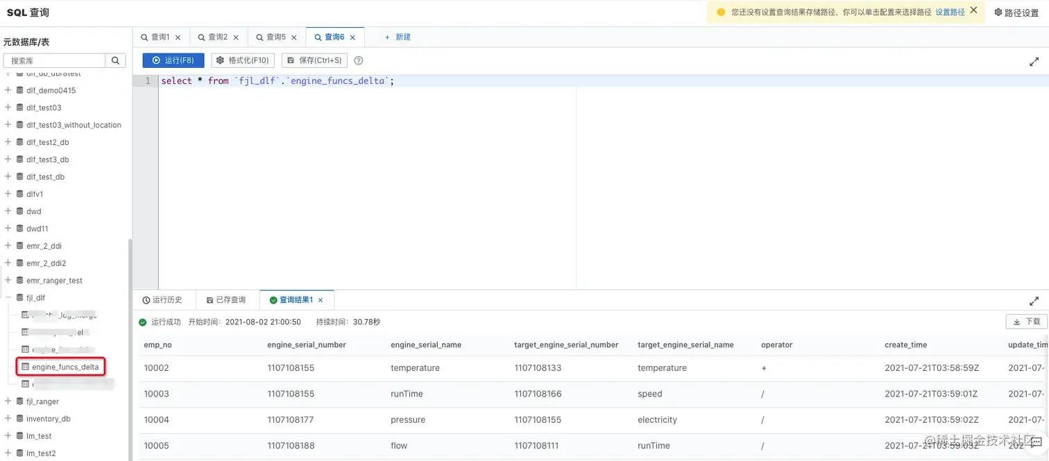 在元数据库表中,找到“fjl_dlf”,展开后可以看到 engine_funcs_delta 表已经自动创建完成。双击该表名称,右侧 sql 编辑框会出现查询该表的 sql 语句,点击“运行”,即可获得数据查询结果。