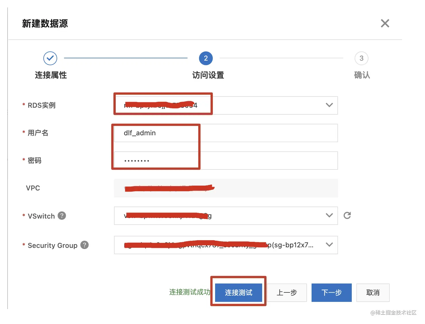 - 点击 新建数据源。填写连接名称,选择数据准备中的使用的 RDS 实例,填写账号密码,点击“连接测试”验证网络连通性及账号可用性。
