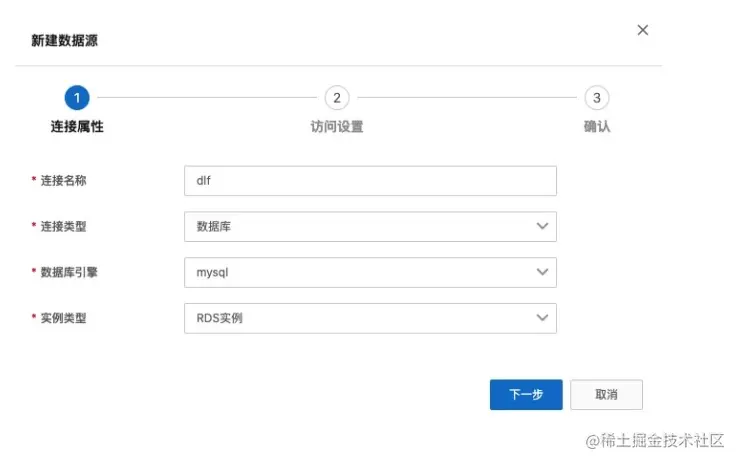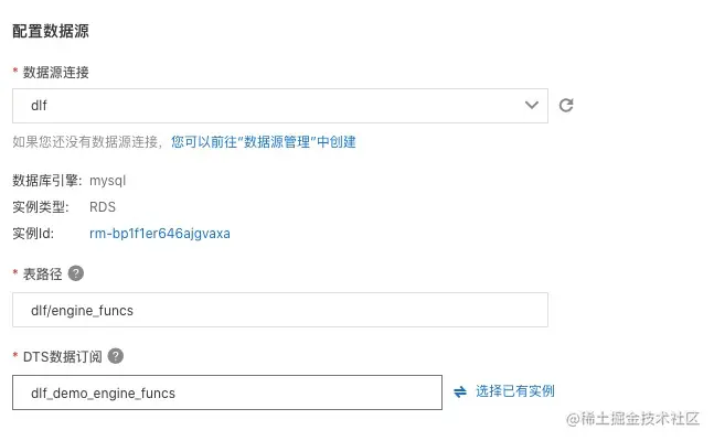 - 配置数据源,选择刚才新建的“dlf”连接,使用表路径 “dlf/engine_funcs”,选择新建 dts 订阅,填写名称。