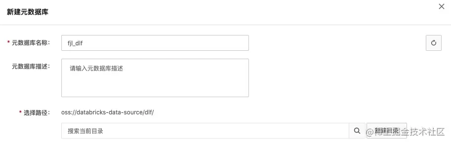 点击左侧菜单“元数据管理”->“元数据库”,点击“新建元数据库”。填写名称,新建目录 dlf/,并选择。