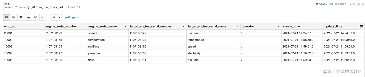 - 点击 Notebook 进入交互式分析页查询同步至 Delta Lake 中 engine_funcs_delta 表数据。