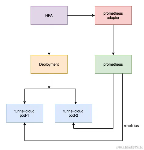 tunnel-cloud 除了根据内存和 CPU 的使用情况自动扩缩容之外,还可以根据与 tunnel-cloud 建立长连接的边缘节点的个数实现自动扩缩容,架构图如下: