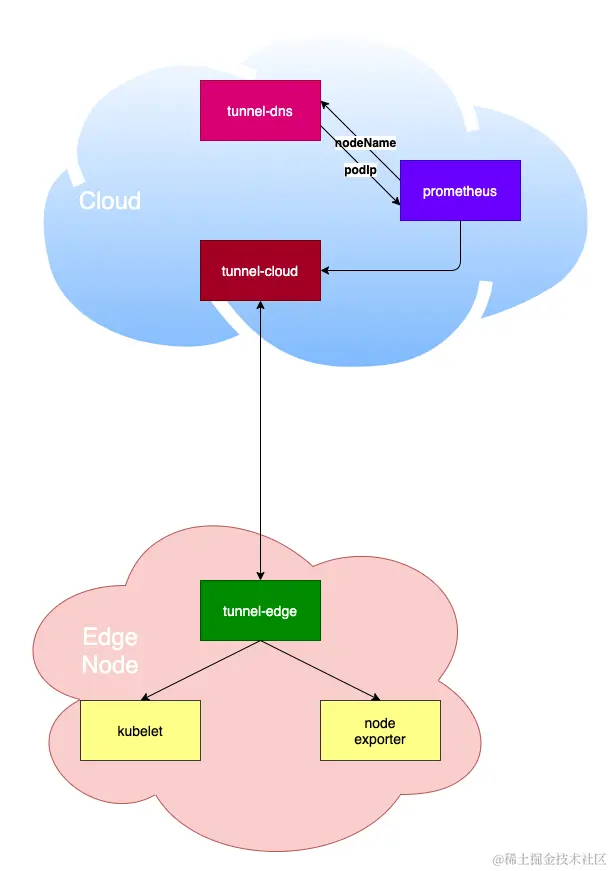 节点监控主要采集边缘节点 kubelet 的 metrics 和 node-exporter 采集到的硬件、系统指标。在部署 Prometheus 时配置 pod 的 dns 指向 tunnel-dns,Prometheus 使用节点名访问边缘节点上的 kubelet 和 node-exporter,tunnel-dns 会把节点名解析为边缘节点的 tunnel-edge 连接的 tunnel-cloud 的 podIp,Prometheus 根据 podIp 访问 tunnel-cloud(其中获取 kubelet 的 metrics 访问的是10250端口,请求 node-exporter 访问的9100端口),tunnel-cloud 通过长连接隧道将请求转发到 tunnel-edge,由 tunnel-edge 向 kubelet 和 node-exporter 发起请求,整个流程的框图如下所示: