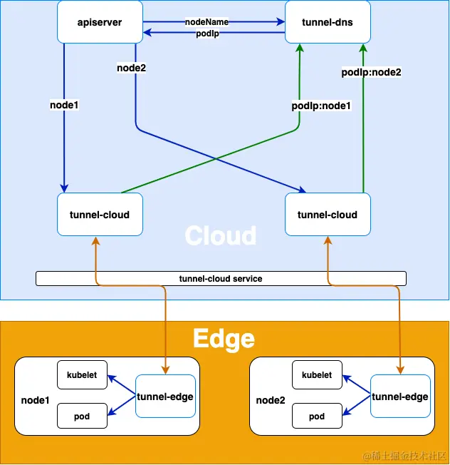 - tunnel-edge 只需和一个 tunnel-cloud 实例长连接即可。apiserver 根据 tunnel-dns 的存储的 tunnel-edge 的 ID 和 tunnel-cloud pod 的映射关系确定请求的 tunnel-cloud pod ,然后再把请求转发到 tunnel-edge。
