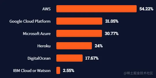 今年也是该调查首次将云平台从通用平台中进行了拆分,AWS仍然占据绝对领先,Google Cloud和Microsoft Azure位列第二第三,二者都取得了较好的收益。