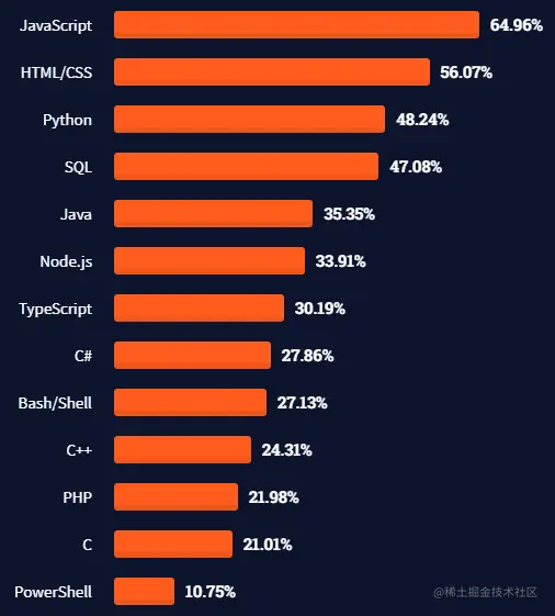 在以往的常用编程语言榜中,JavaScript、html/css、SQL三大流行语言稳坐前三,但今年SQL滑落第四,python升至第三名。JavaScript已经连续九年排在了最常用编程语言榜第一名。