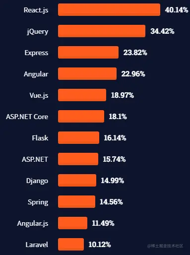 3. React.js成为最常用的web 框架,已经超越jQuery。