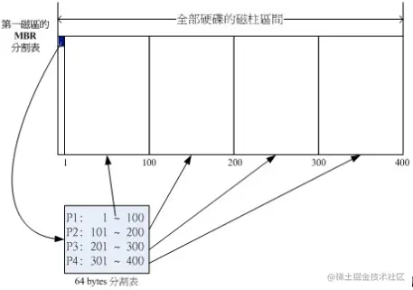 早期的linux为了兼容windows的分区格式,因此使用的是MBR分区,而开机管理程序与分区记录表则放在第一个扇区,通常此扇区大小为512Byte,开机管理程序占用446Byte,分区记录表占用64Byte。