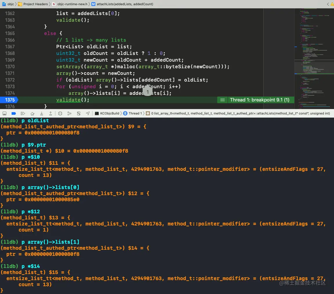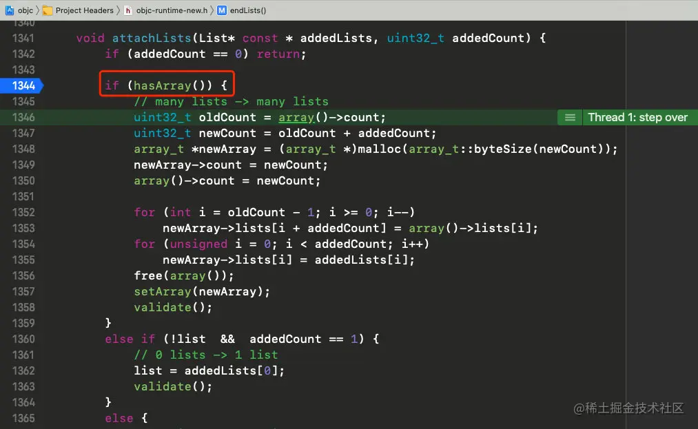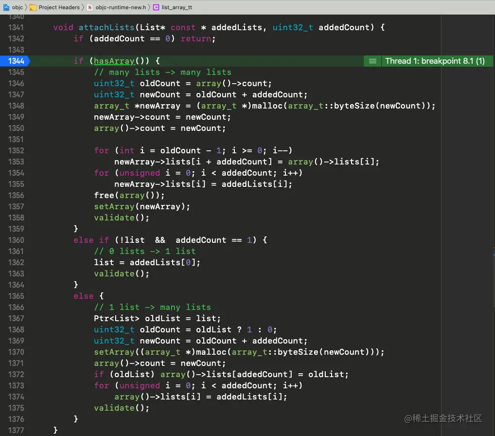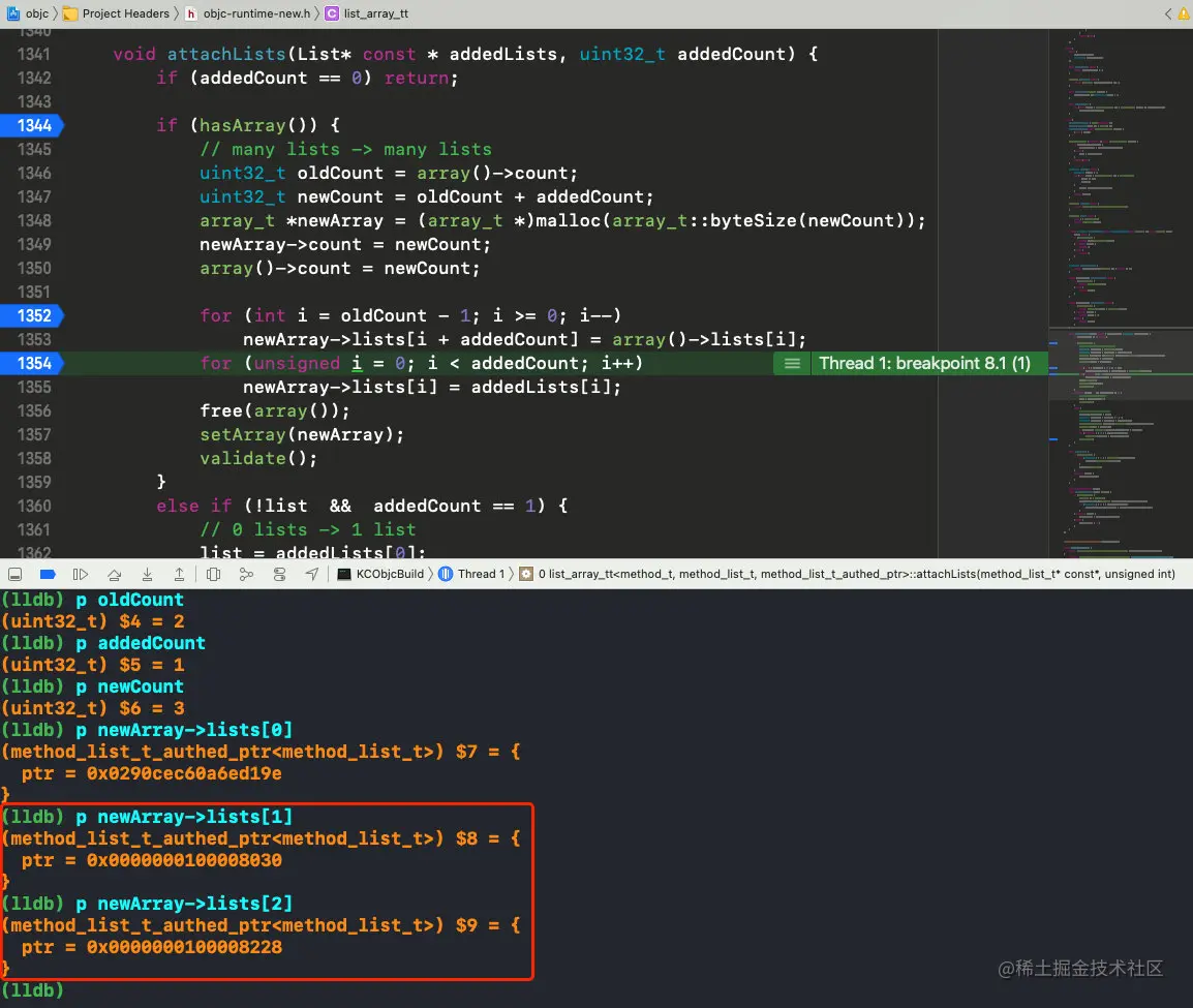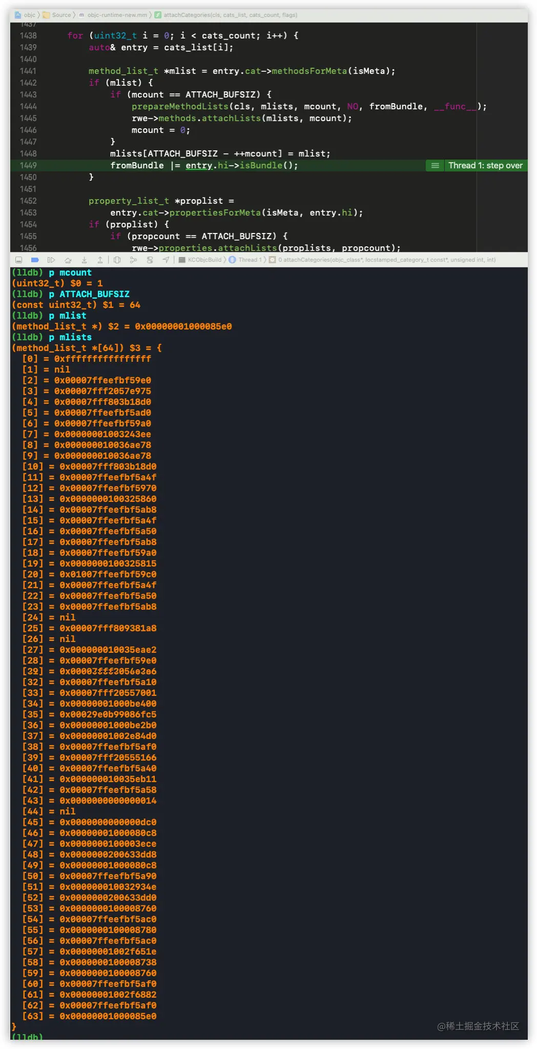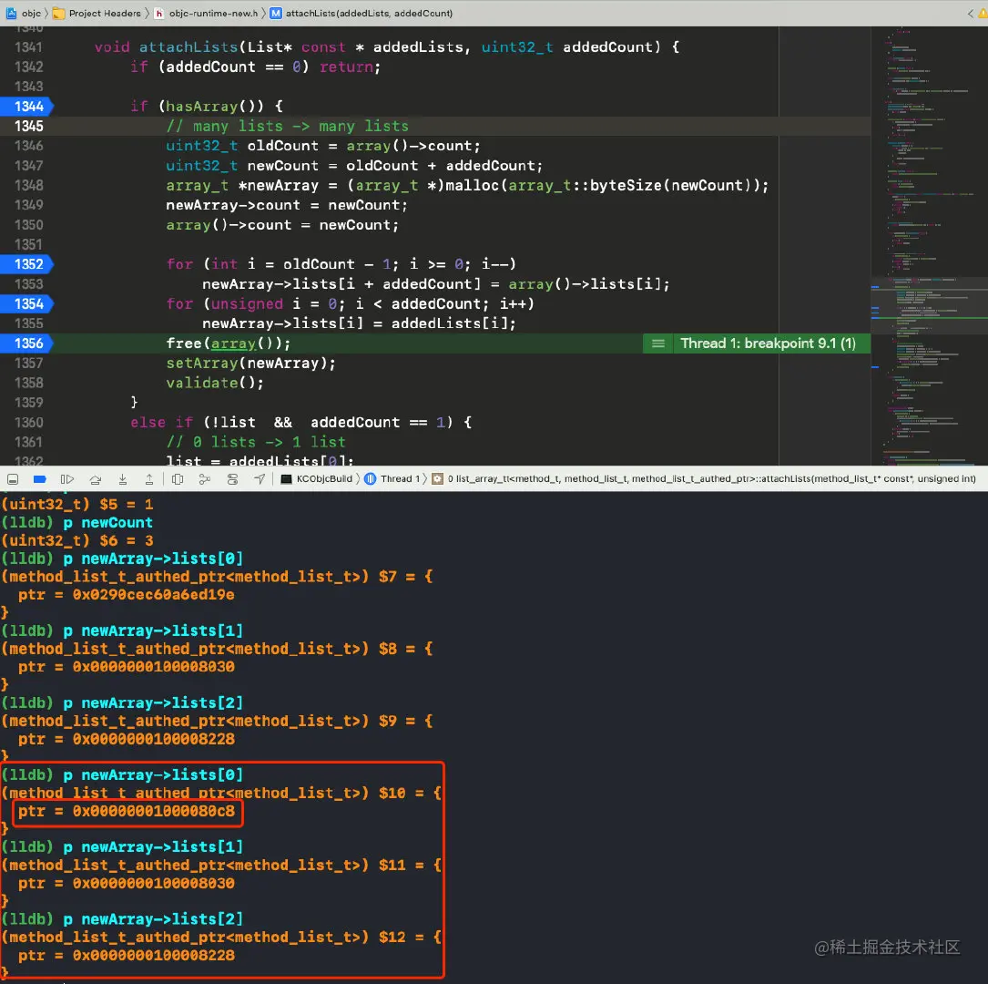 继续执行,即将进入attachLists方法,传入一个二维指针,这个指针(最终指向了分类的方法地址):