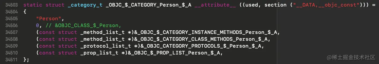 多出了(const struct _protocol_list_t *)&_OBJC_CATEGORY_PROTOCOLS_$_Person_$_A,