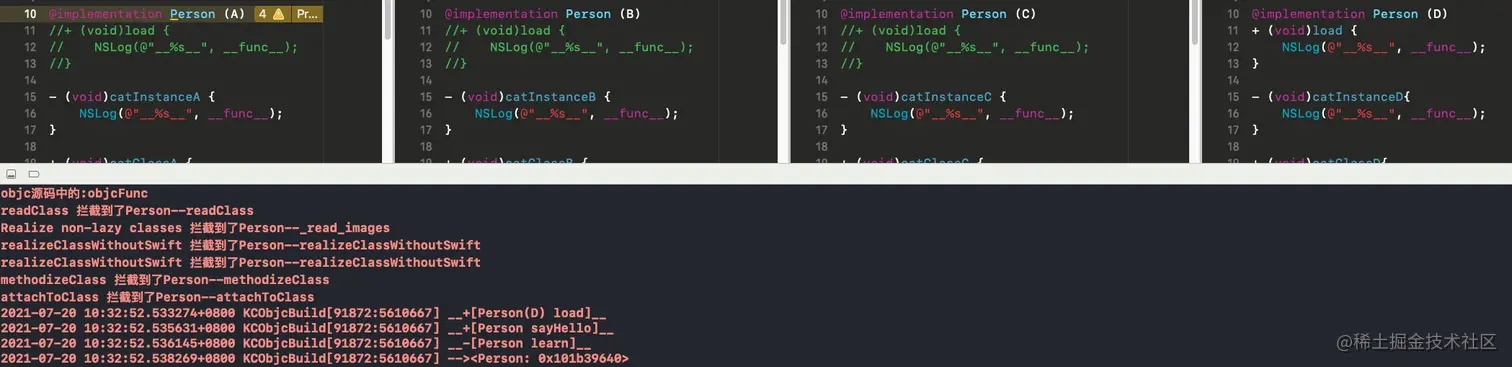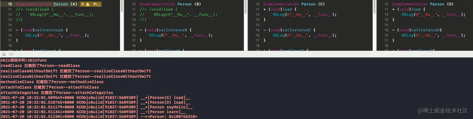 说明Person+A,Person+B,Person+C,Person+D四个分类,非懒加载的相关函数也都会被调用;其流程与主类和分类都实现load方法是一样的,最后都是通过attachCategories实现分类加载;