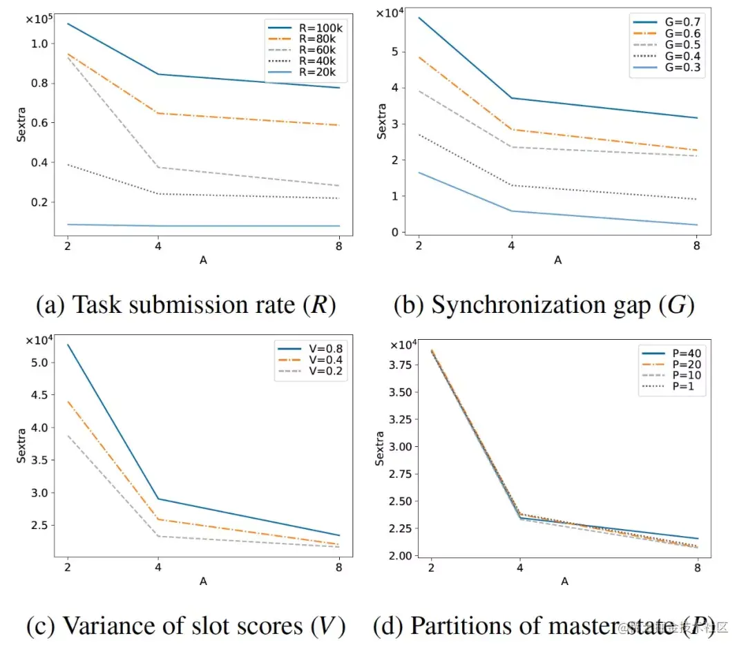 - 图c反映的是机器分数(比如更好的硬件性能)对冲突的影响,V表示机器分数的方差,可以看到在调度器数量相同的情况下,随着V的增大,为了保持冲突不发生明显的变化,需要额外补充的slot数目就越多;反过来,在V不变的情况下,随着调度器数量的增加,每个调度器承受的调度压力下降,需要额外补充的slot数目就越少。