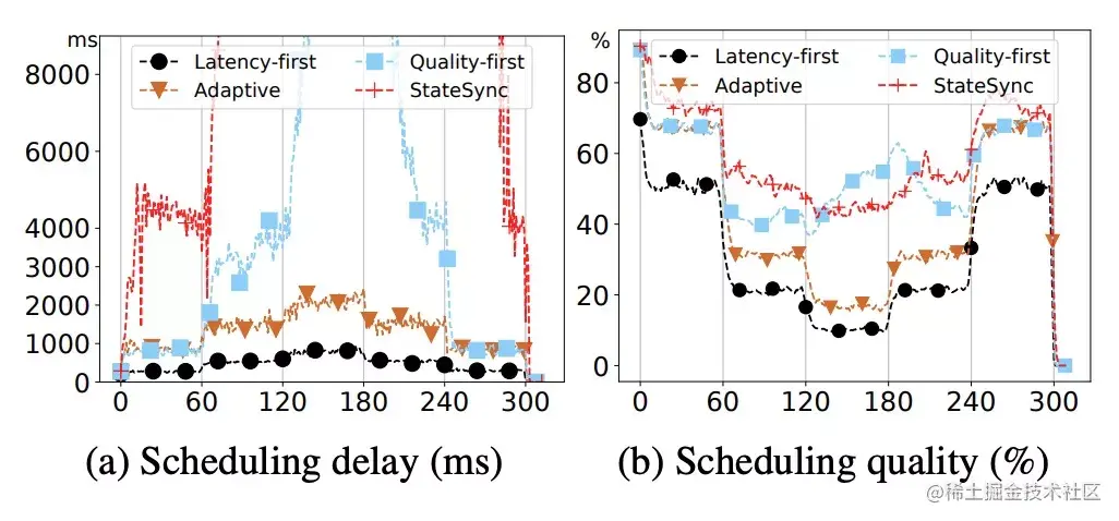 从图(b)中可以看出,随着调度压力的变化,latency-first和adaptive策略在quality上表现都有一个明显的下降,这个符合预期。而quality-first的表现基本和StateSync持平。