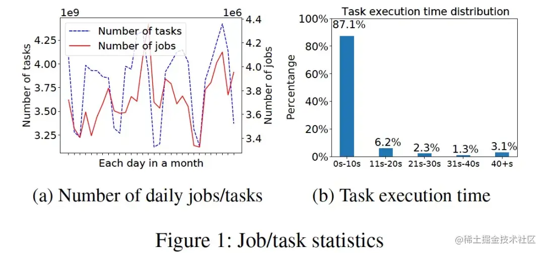 在阿里巴巴,单个计算集群每天运行着数百万的作业。图1a(实心曲线)绘制了一个集群某个月份内每天随机处理的作业数,334万至436万,而一个作业由许多任务组成,图1a(虚线)显示每天的任务数量大概为从31亿到44亿。其中大部分任务都是短时任务,如图1b所示,87%的任务在10秒内完成。大规模集群的调度负载还是非常大的。