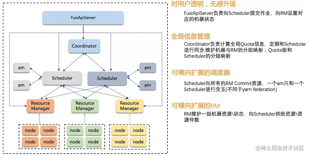 经过十几年的积累,伏羲的资源调度器通过各种策略在上述几大目标间实现了很好的权衡,但考虑资源调度周边还有其他兄弟团队开发的应用组件,我们在设计新的调度器时,也应该做到尽量少改动,以保持系统的健壮性和向前兼容性。调度器架构调整引入的系统升级应该对用户是透明的,不管是内部用户还是外部用户。