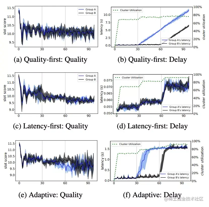 - 从(c)(d)可以看到,在阶段1调度器压力只有2/3的时候,调度latency和quality都是表现比较好的。随着调度压力的增加,quality质量开始出现了下降,但是latency的增加却非常有限,这也符合直觉预期。