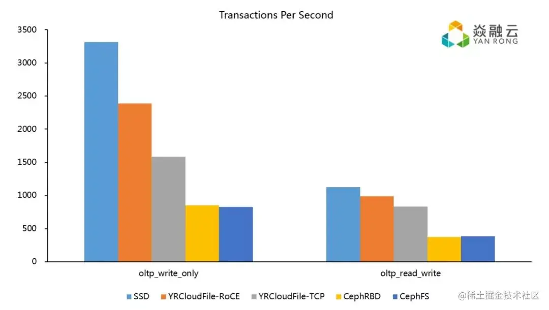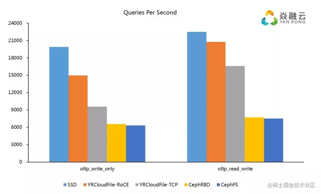- 直接使用物理SSD时,由于是进行本地SSD读写,延时很低;且MySQL应用为了确保其操作的顺序性,主要是采用有限线程低并发进行顺序追加写,延时性能决定了单个MySQL的整体性能,因此无论YRCloudFile还是Ceph存储集群对单个MySQL实例而言,会受到延时影响,性能不如本地SSD盘。