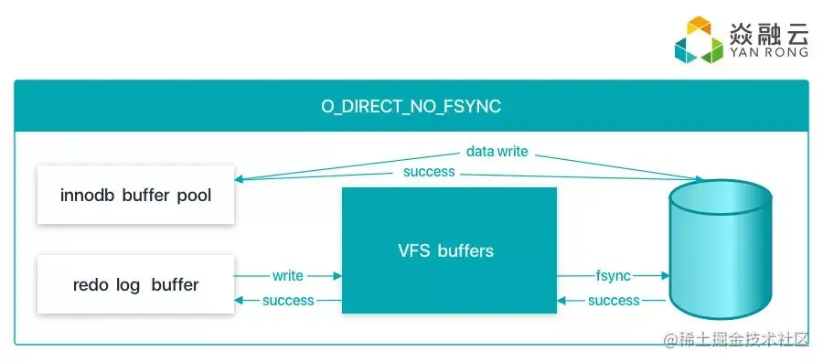 - O_DIRECT_NO_FSYNC:只使用O_DIRECT方式,绕过pagecache,将数据直接写入磁盘,并在写操作时跳过fsync()更新日志的元数据信息。在8.0.14版本之后, MySQL会在创建文件、增加文件长度以及关闭文件时自动调用fsync()来更新MySQL文件在文件系统中的元数据信息。