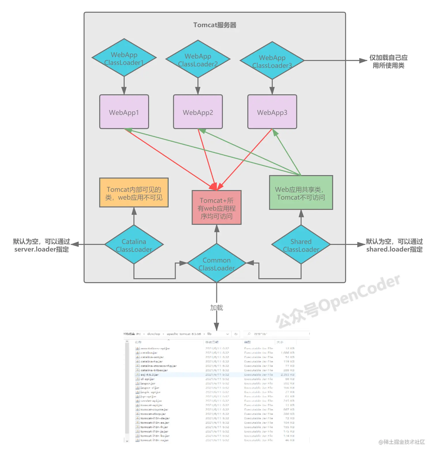 首先Tomcat会通过Common类加 载器来加载本地lib包下的核心文件,比如servlet-api.jar、jsp-api.jar、el-api.jar等,这些类可以供Tomcat以及所有的WebApp进行访问和使用。
