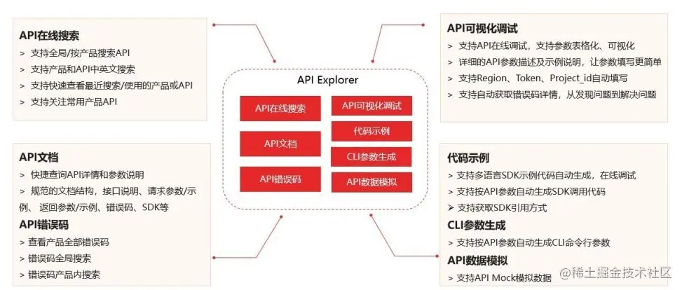 从华为云官网——开发者——资源工具,即可进入到 API Explorer 页面,这里包括华为云开放的所有 API 信息,选手在这个平台上可以快速的查看、搜索 API 文档,以及可视化调试 API,具体的关键能力如下图所示。