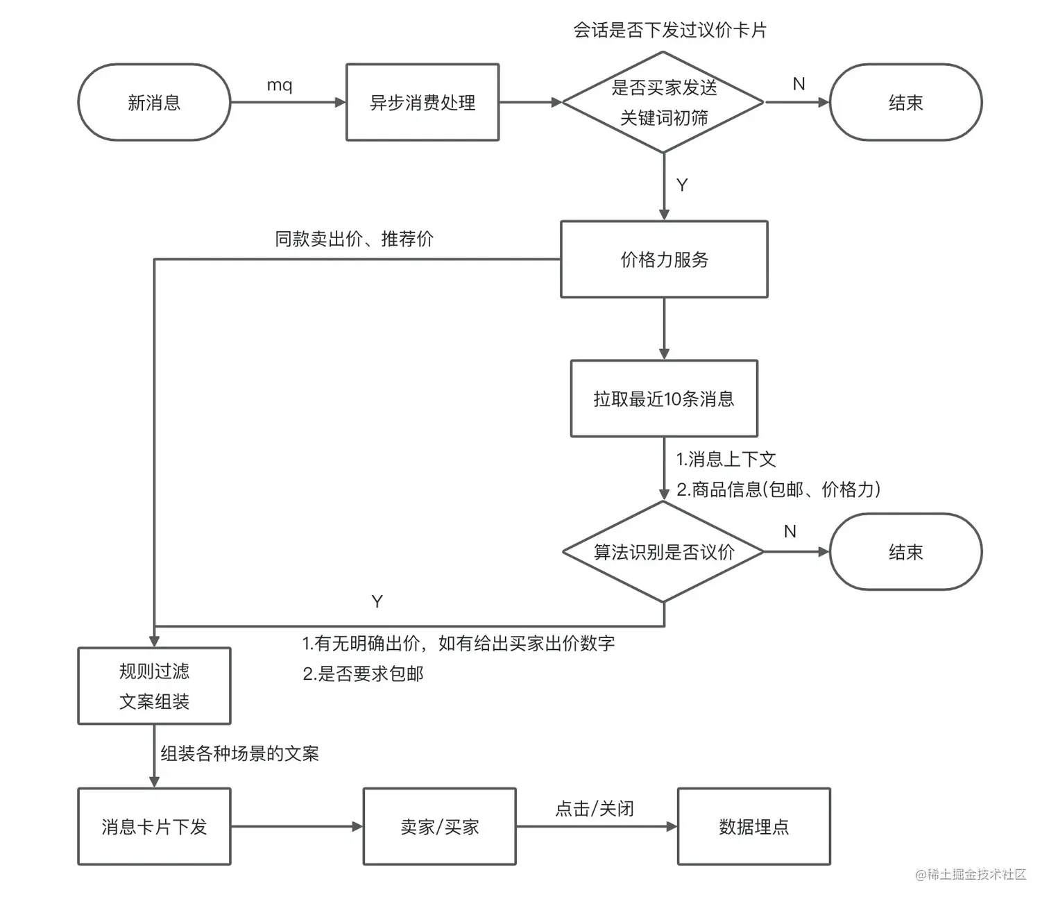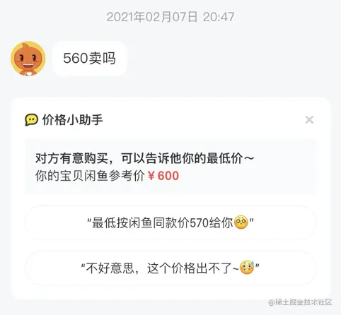 为了不影响消息主链路,识别流程必须走异步mq消费流程,同时为了减少算法识别的压力,对消息进行了消息类型、发送者、关键字过滤、会话疲劳度控制等规则的初筛。此外,我们还联动了商品的价格力数据,价格力数据可以提供商品的同类同款卖出价以及推荐价,通过算法综合择优,可以给出商品建议价,再根据买家出价情况,走不同的产品逻辑组合成不同场景下的同意/拒绝文案选项。这样无论买家出价是否合理,卖家是否接受,给卖家提供友善的议价话术选择,让买卖双方还有继续聊下去的机会,就还有成交的希望。如果买家出价不合理,也会给买家下发议价不合理的卡片,给出同类商品的参考价,拉平买家的价格预期。