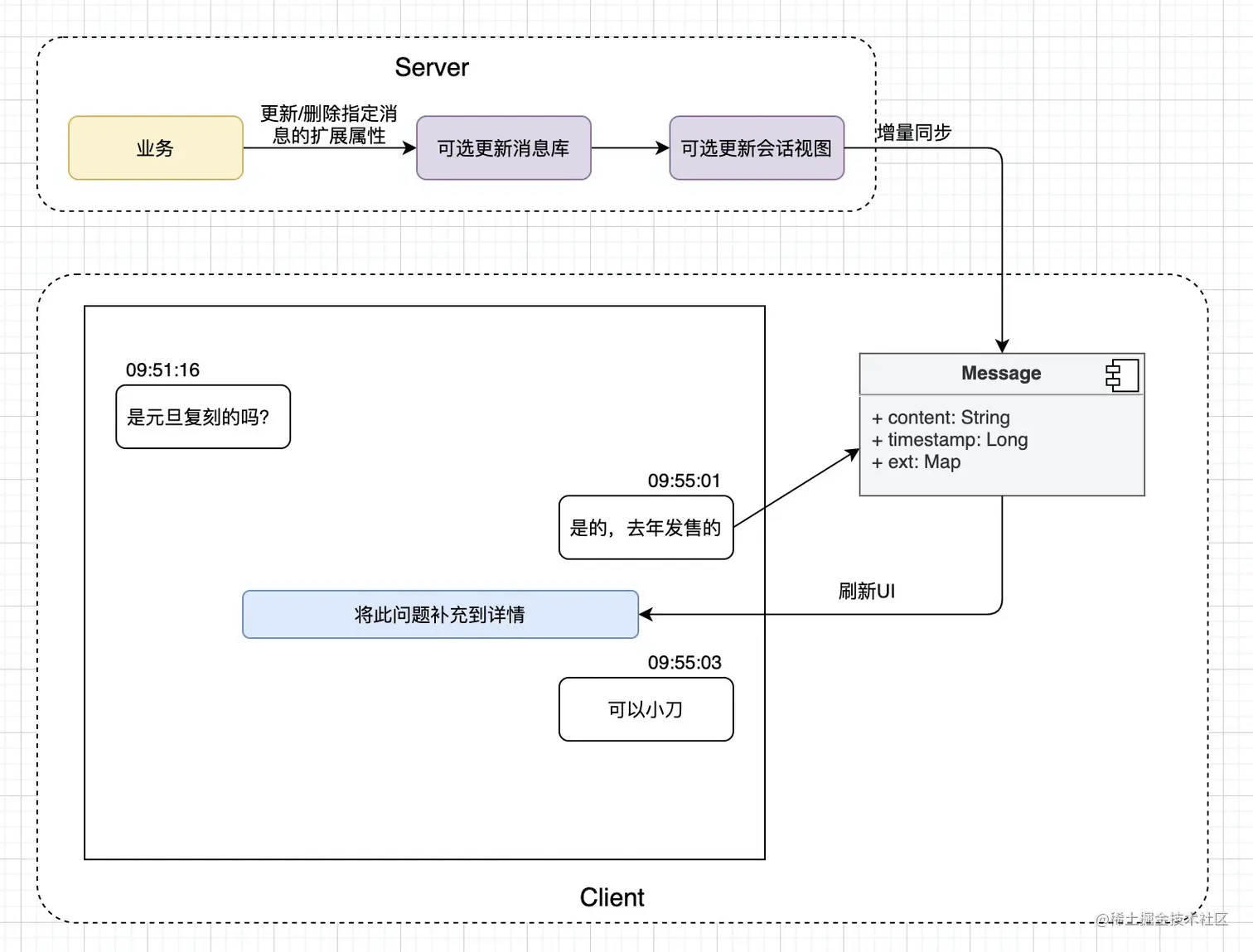 由业务发起对某条消息的扩展属性变更,可选设置存储服务端消息库,更新会话视图,比如问答场景的tip,是有时效性的,只需要透传给客户端,服务端完全不需要存储。该方案也为以后消息的个性化变更及展示提供了可能。
