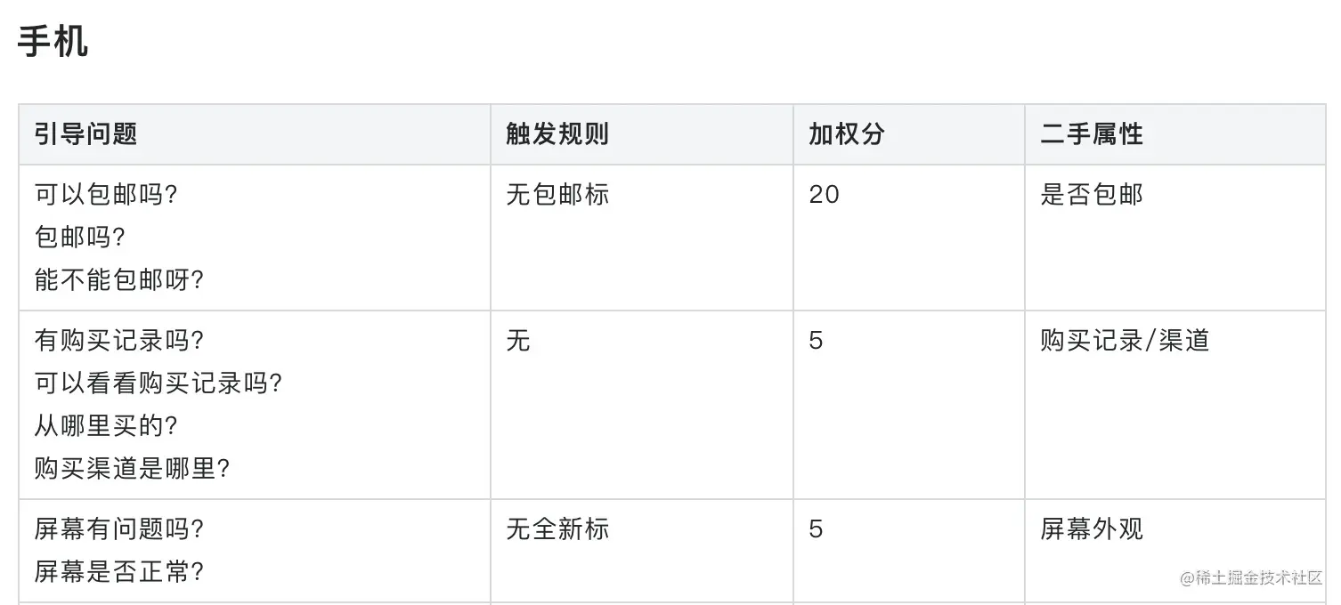不同类目的商品聊天中买家关注的问题点不同,我们基于离线数据分析,回捞了一批不同类目买家最关心的问题列表,把这些问题首先按类目分类,其次按关注点(二手属性)分类,再加上触发规则条件、权重分,形成一套开场白问题库,可由产品运营自助添加修改。