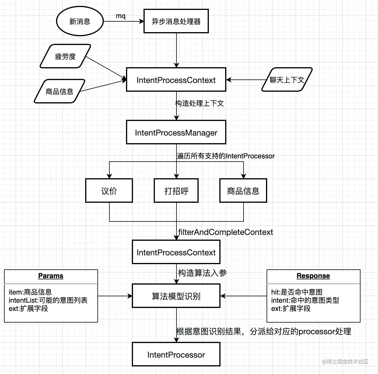 前面已经实现了议价意图的算法识别,这次又要新增一种打招呼的识别,是否要重新开发整个流程呢?显然不需要,前期议价为了快速迭代上线看效果,没有抽象设计成一种通用的意图识别流程,这次新增第二种意图识别,有必要还债重新设计了,任何优秀系统的设计都是不断迭代重构产生,绝不会是一蹴而就的,项目初期在需求不明确的情况下如果考虑的过多,往往会导致过度设计,后面如果需求变动,又要返工。故重新抽象设计一套通用的意图识别流程框架。