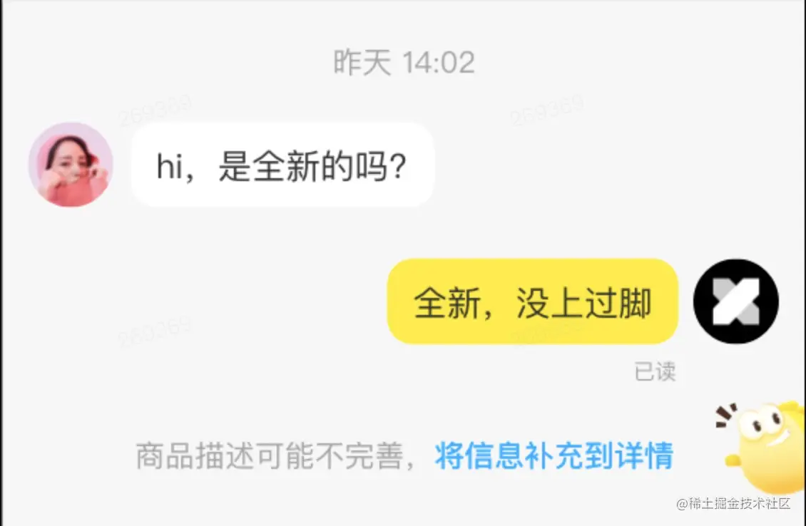 相信这几乎是每个闲鱼卖家都司空见惯的聊天开场白,但很多卖家见多了反而不愿意回复这类没有营养的问题,内心os:"不在还挂着干啥???"。我们本着让买卖双方的聊天有一个愉快的开始的目的,考虑从2个方面优化这个场景的问题: