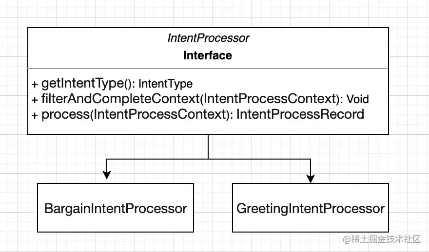 如上图所示,每种意图需要实现IntentProcessor接口,实现自己的过滤和处理逻辑,不同意图有不同的初筛逻辑和扩展参数,filterAndCompleteContext这个方法是用来过滤和补充意图识别扩展参数到流程上下文中的,如果满足初筛条件,就添加该意图类型到可能的意图列表中,由算法识别最终结果,如果一条消息存在多种意图,由算法根据优先级规则选出最相关的意图。得到意图识别结果后,调用对应的IntentProcessor的process方法,完成具体的业务逻辑处理,如在议价场景是根据价格规则,组装不同文案下发建议卡片。