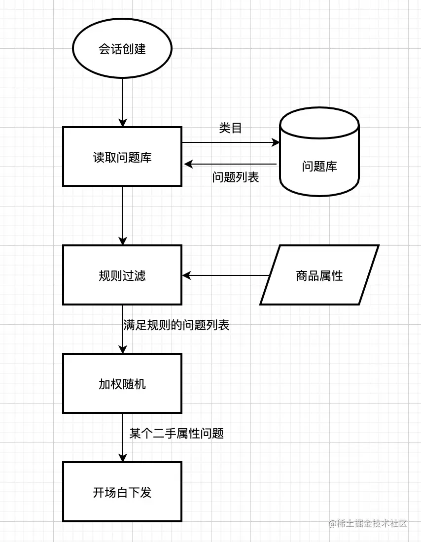 如上图所示,当会话创建时,先根据类目读取问题库得到对应的问题列表,再根据这个商品本身的一些属性标,如是否包邮,是否全新,按规则筛选出符合条件的问题列表,再根据权重分对满足条件的问题进行加权随机,最终得到某个二手属性的问题项。为了保证问题内容的多样性,每个二手属性的问题项也会有不同文案但相同语义的表达,最后再次随机一个具体问题表达,即可下发建议卡片。