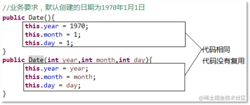 通过上图可以看到无参数构造方法中的代码和有参数构造方法中的代码是一样的,按照以上方式编写,代码没有得到重复使用,这个时候就可以在无参数构造方法中使用“this(实际参数列表);”来调用有参数的构造方法,这样就可以让代码得到复用了,请看: