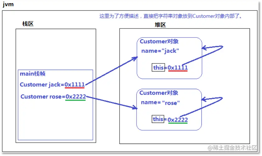 通过以上的内存图,可以看出“jack引用”保存的内存地址是0x1111,对应的“this引用”保存的内存地址也是0x1111,所以“jack引用”和“this引用”是可以划等号的。也就是说访问对象的时候jack.name和this.name是一样的,都是访问该引用所指向对象的name属性。\