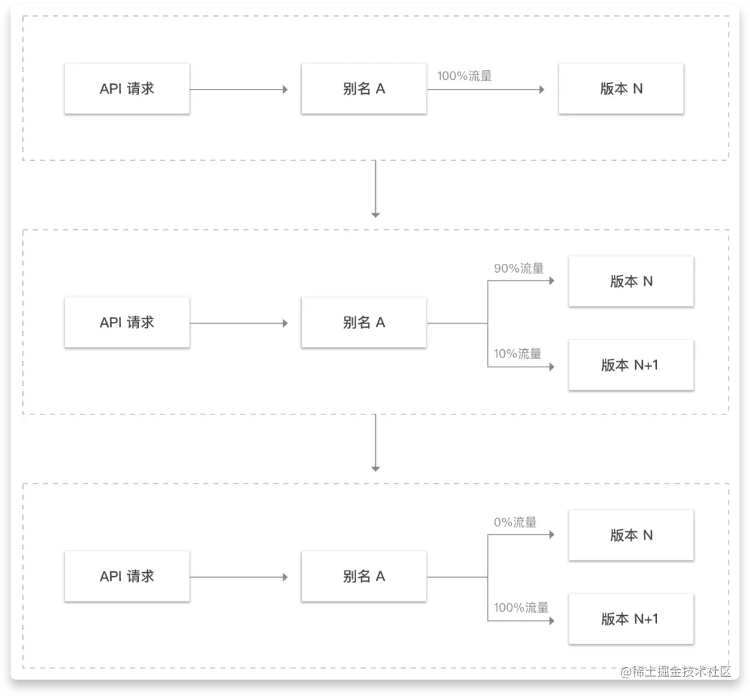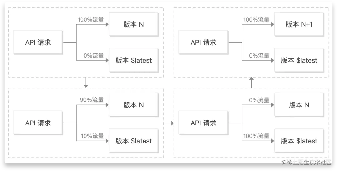 默认别名是配置云函数的 latest 版本,一个为最后一次函数发布的版本。部署时配置的 traffic 参数为 latest 版本上。版本发布时先切部分流量在 latest 版本。当流量切到 100% 时,固化当前版本,并将流量全部切到固化后的版本。