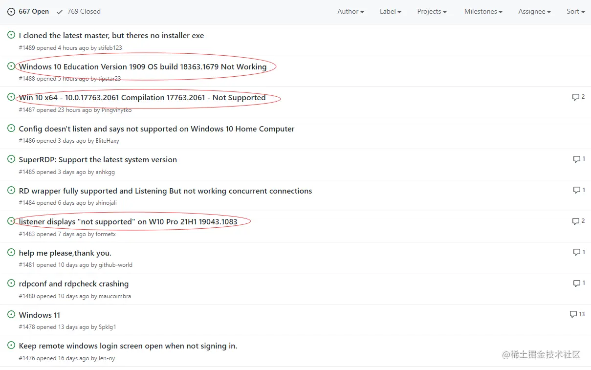 而在 rdpwrap 日志中找到支持最高版本为 10.0.17763.1 (Windows 10 Build 160101.0800) 。同时在项目的问题反馈中可以看到其他人遇到的同样问题。