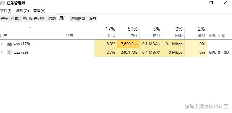 在本机创建两个用户,我创建 wzz 和 wxy 两个用户,然后同时远程登录(注意把用户设为允许远程登录)。在任务管理器中可以看到登陆用户信息: