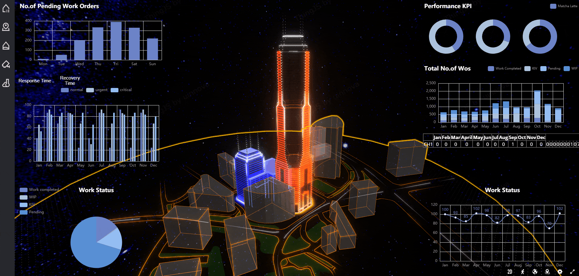 企业数字可视化转型可借助ThingJS 面向物联网的开发平台构建虚拟三维可视化模型,直观的展示现实世界的场景。基于物联网技术全面三维可视化;层次化递进浏览监控企业区域、园区数据中心、机房、机柜、设备、端口;包括业务系统运行状况及可用性可视化、网络以及业务系统的可视化;运维服务流程管理的可视化、流程考核可视化、运维大数据可视化等。