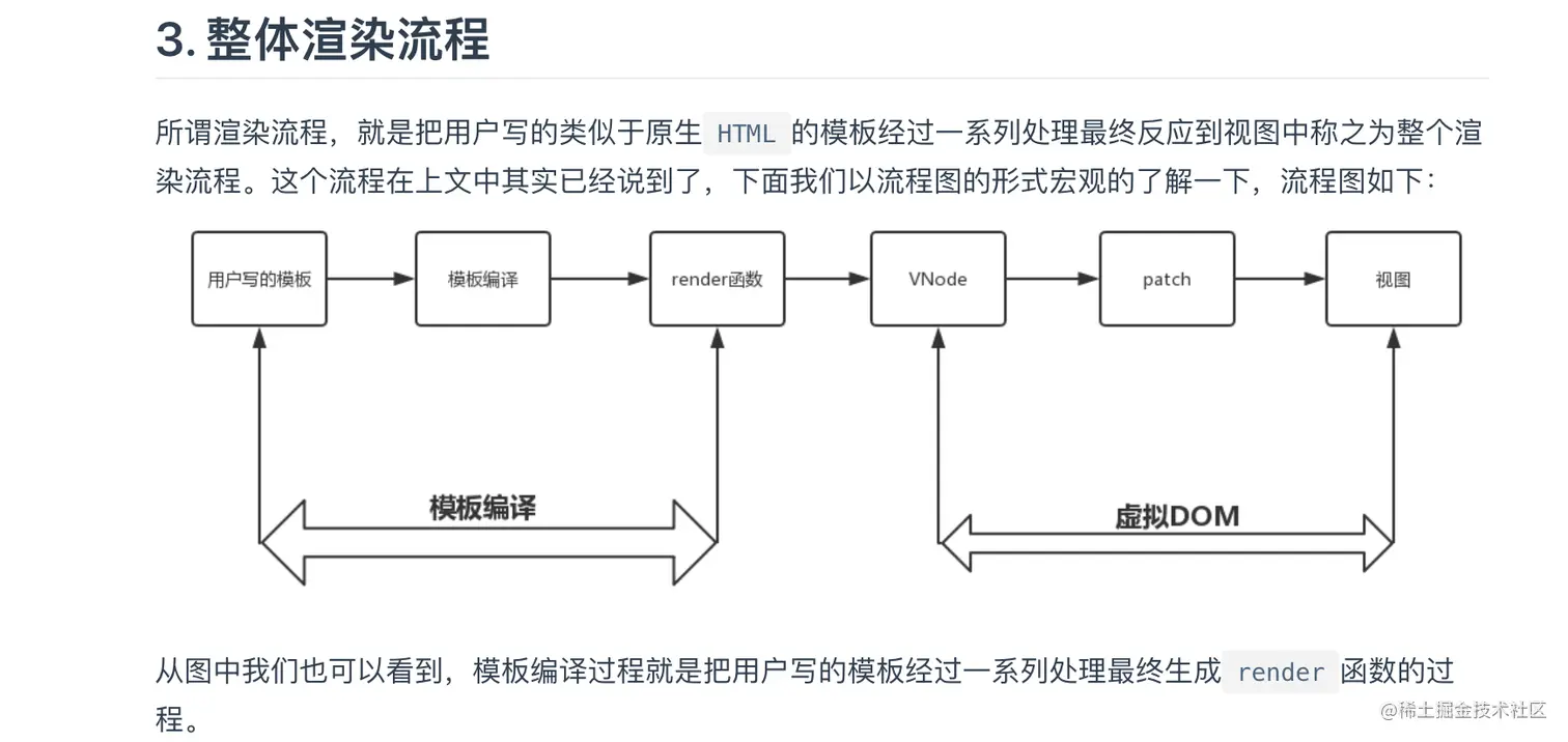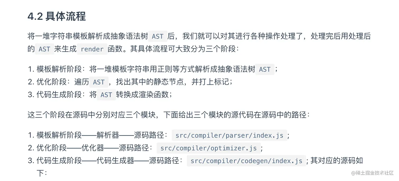 简而言之,就是首先转化成AST( Abstract Syntax Tree,抽象语法树),即将源代码语法结构抽象成树状表现形式,然后通过 render函数进行渲染,并返回VNode( Vue. js的虚拟DOM节点)。 详细步骤如下。 (1)通过 compile编译器把 template编译成AST, compile是 create Compiler的返回值, createCompiler用来创建编译器。另外, compile还负责合并 option。 (2)AST会经过 generate(将AST转化成 render funtion字符串的过程)得到 render函数, render的返回值是 VNode, VNode是 Vue.Js的虚拟DOM节点,里面有标签名子节点、文本等。