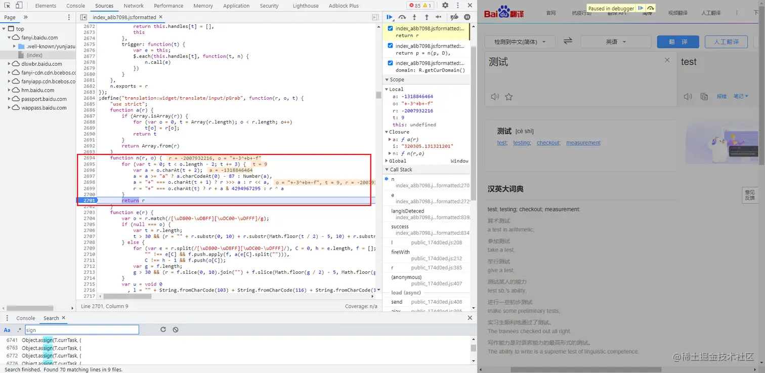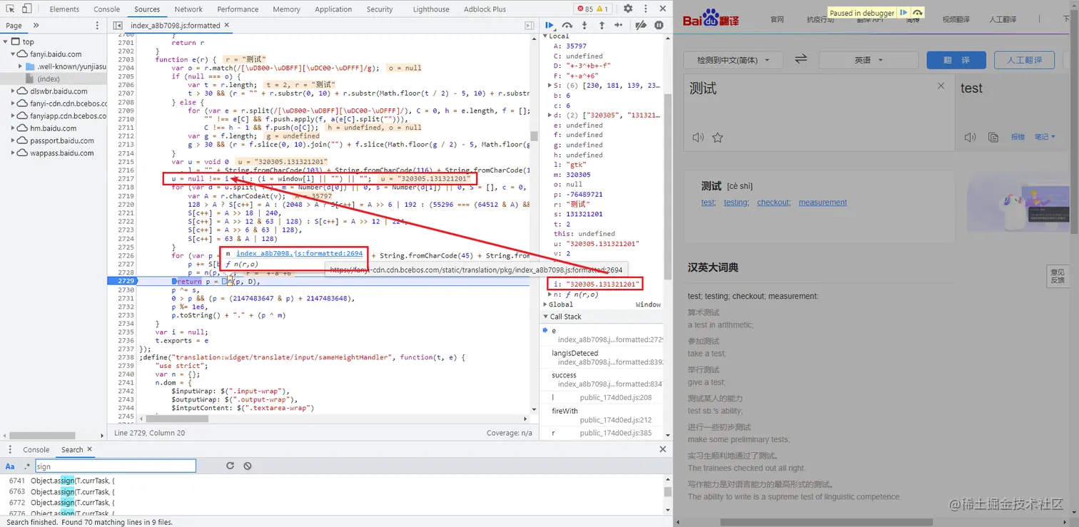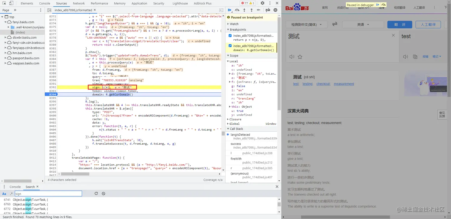 点击行号,在此处埋下断点,点击翻译按钮,可以看到成功断下,此时 sign 的值就是最终我们想要的的值: