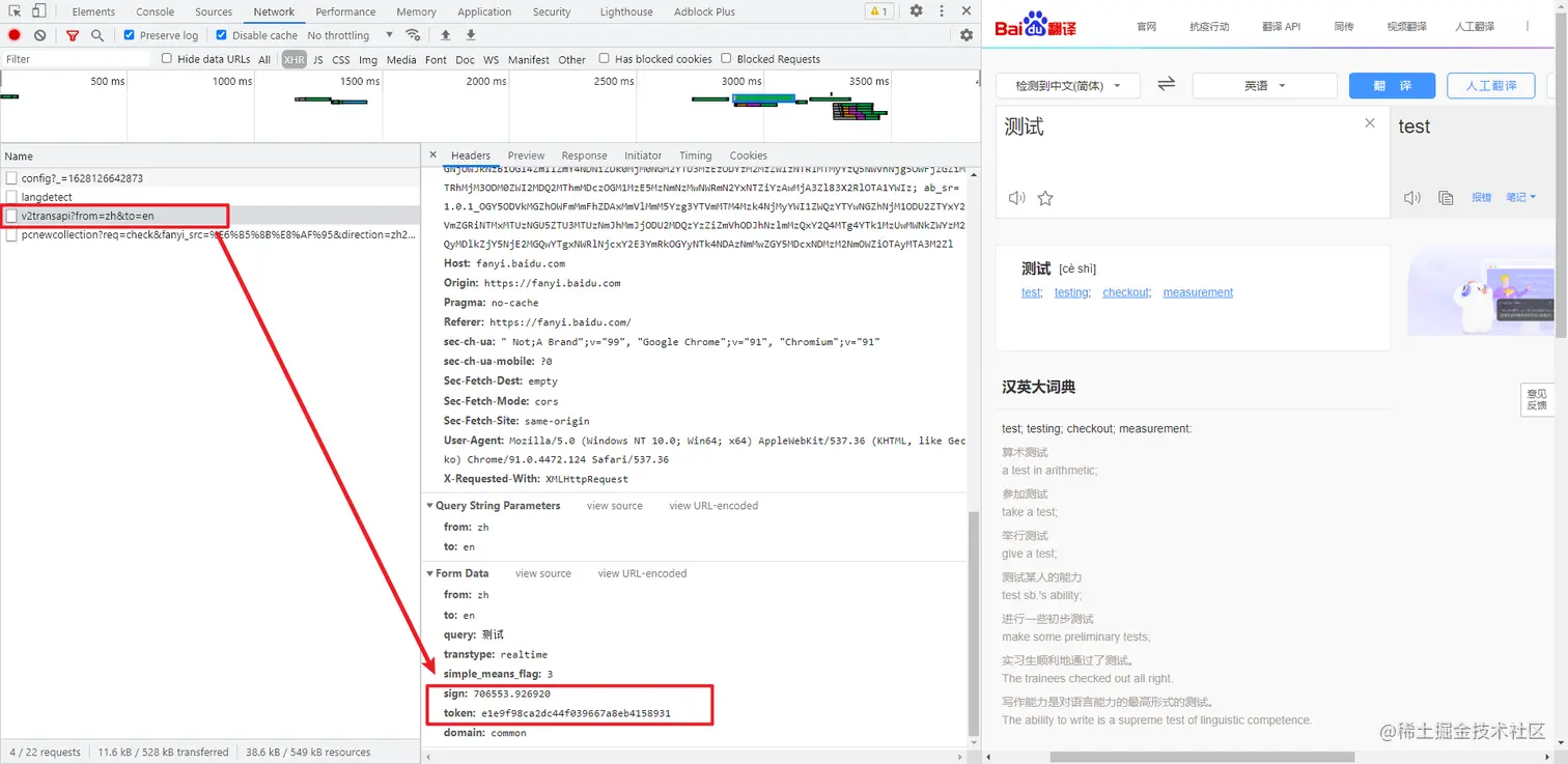 from:待翻译的语言;to:目标语言;query:待翻译的字符串;transtype:实时翻译realtime,手动点击翻译translang;simple_means_flag、domain:固定值;sign:如果待翻译字符串改变的话,它的值也会跟着变,需要进一步分析;token:它的值虽然不会变,但是不知道是怎么来的,需要进一步分析。